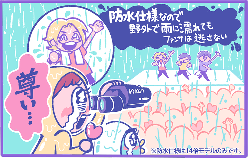 Vixenの防振双眼鏡※は防水仕様のため野外でも安心。「あらゆる方向からの水の飛沫を受けても有害な影響を受けない」IPX4の防水仕様なので天気が崩れても、手ブレなく観賞し続けることができます。「雨に濡れようが最後まで推しを追い続ける!」というあなたの気持ちに応えてくれます。