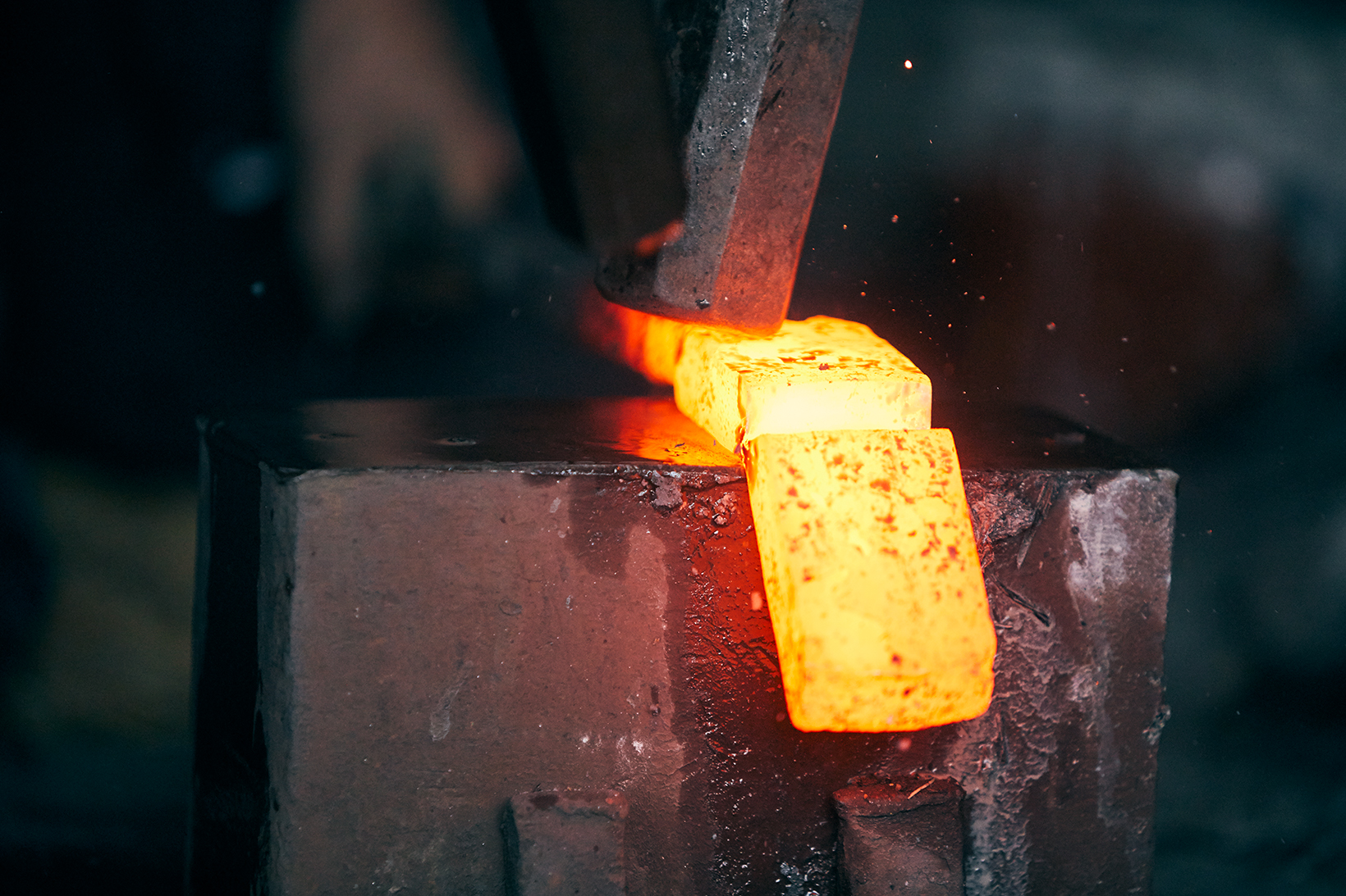 火床で熱して切れ目を入れた真っ赤な鋼は、柔らかそうに曲がります。折り返して重ねた鋼は大槌で叩かれ、またひとつになります。