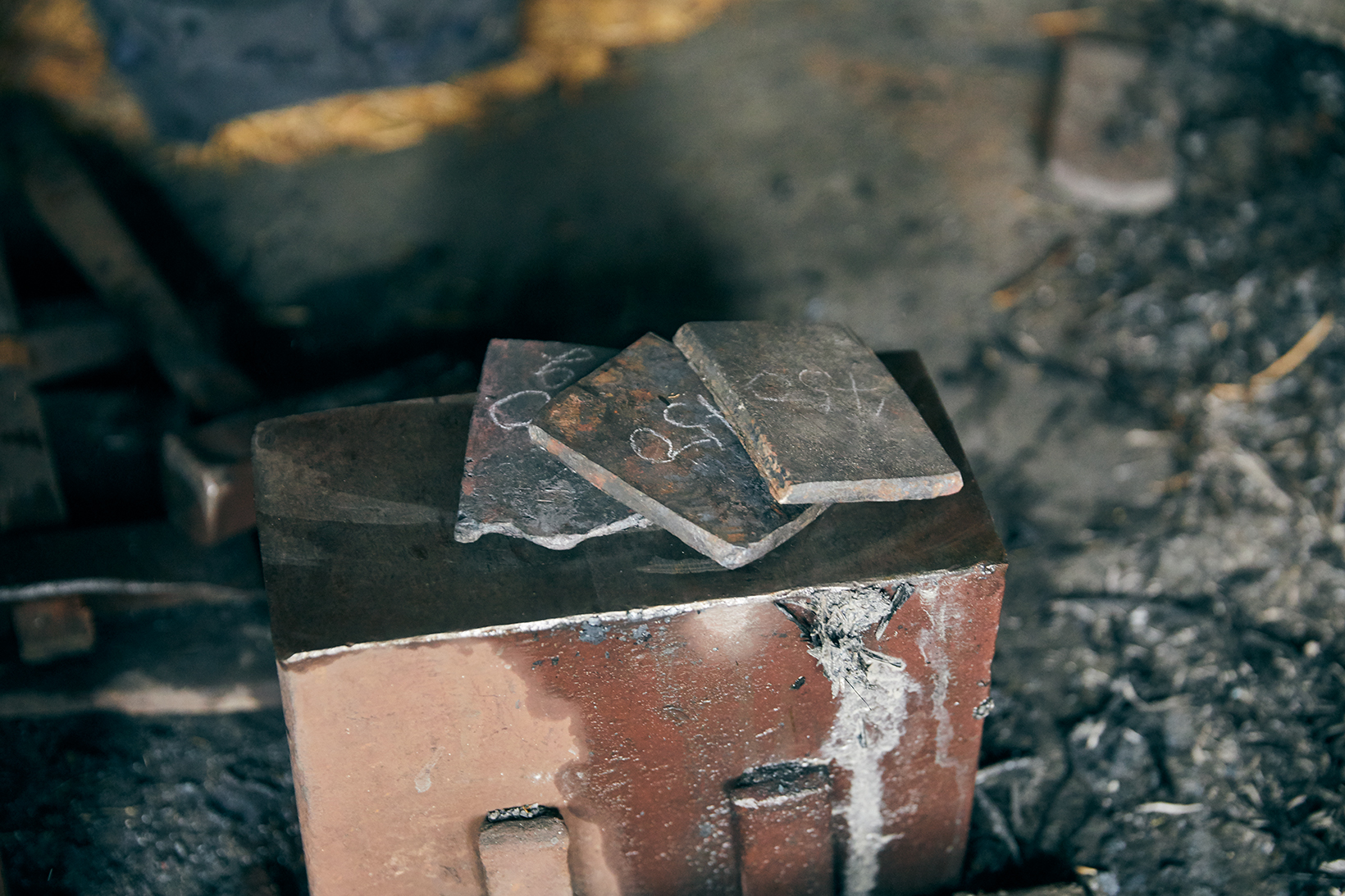 玉鋼は砂鉄を原料に、日本古来の製鋼法によって造られた良質の鋼材。最上質の鋼として日本刀の製作には欠かせない材料です。