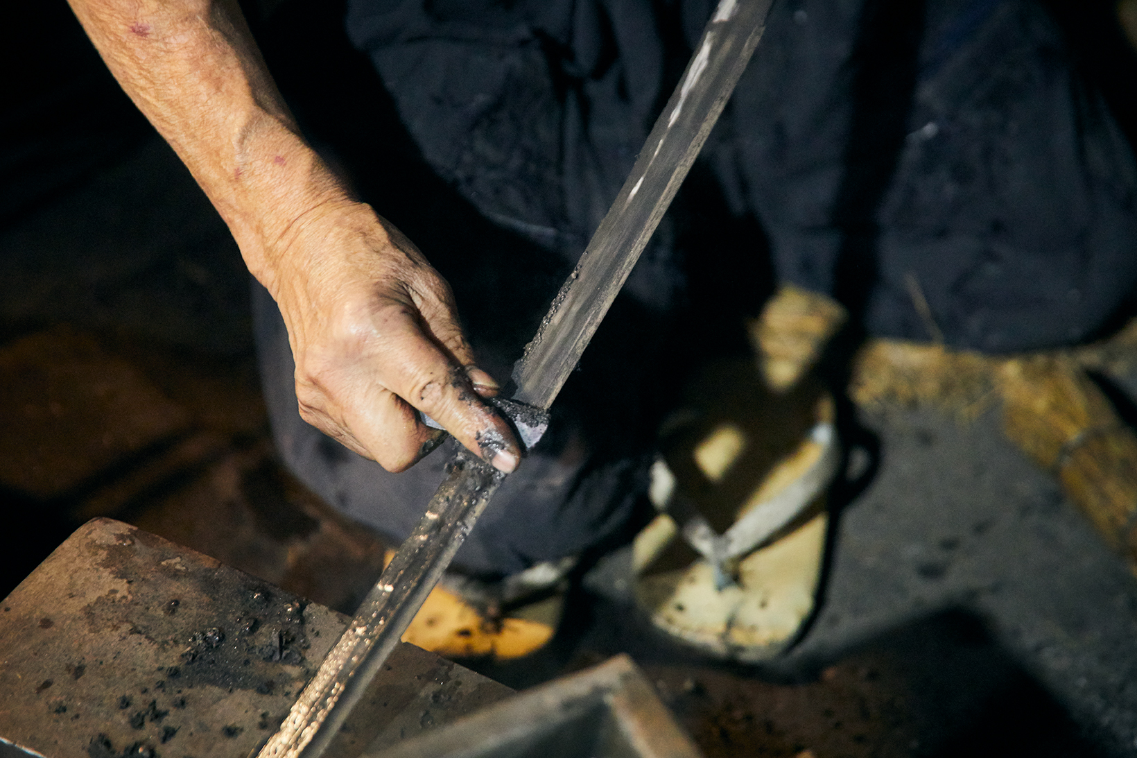 刀匠はまんべんなく、刀身を前へ押し出したり、引いたり平均的に熱されるように動かし続けます。
