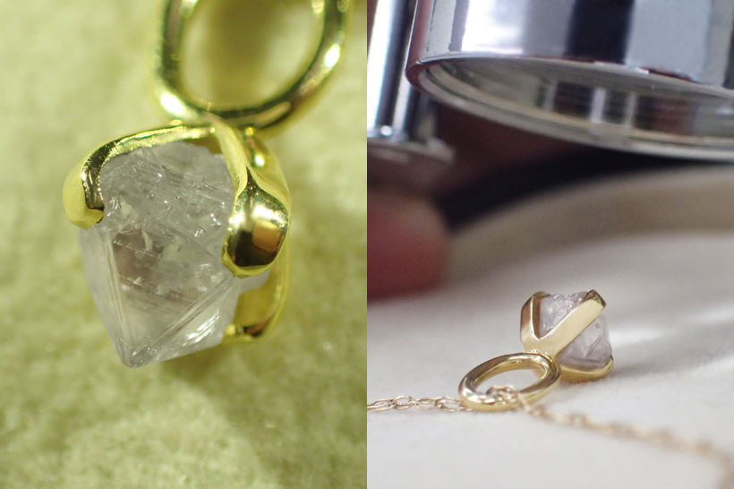 ダイヤモンドは炭素が結晶化した天然鉱物で、地球上で最も硬く普遍的な輝きを放ち続ける物質です。地球の膨大なエネルギーにより誕生したダイヤモンドは、まさに大自然が創りだした芸術品であり、“奇跡の結晶”と呼ばれています。今回はダイヤモンドの原石を使ったアクセサリーを観察してみました。