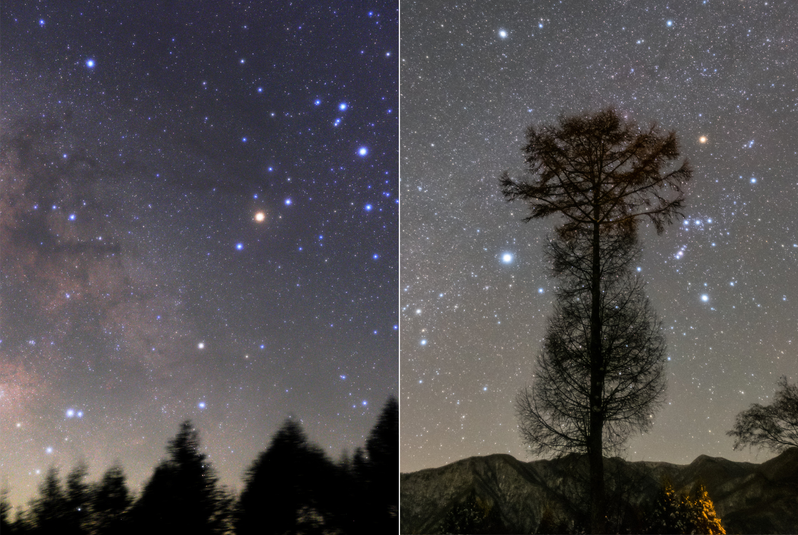 ちなみにどのくらいの露出で星が流れるのか?の判断基準には「500rules(500÷35mm換算の焦点距離)」という考え方があります。あくまで目安としてですが、この計算式の答えよりも長く露出をする場合は星空雲台ポラリエなどの赤道儀を使うと良いでしょう。<さそり座>の作例は、このルールに則ると約9秒以上の露出からどんどん星が流れていってしまうため、ポラリエを使って星追尾モードで追尾撮影を行っています。<冬の大三角とオリオン座>の作例は、約20秒以上の露出からどんどん星が流れていってしまうため、ポラリエの星景撮影モードを使って少しだけ追尾撮影を行い、星が流れてしまうのを最小限に抑えています。