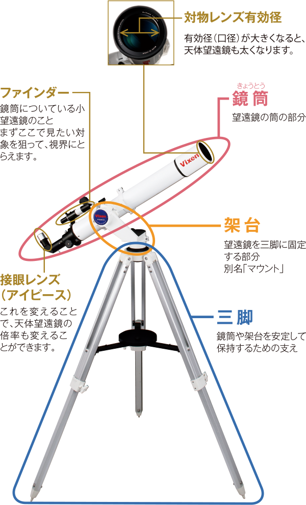 天体望遠鏡は、レンズや反射鏡が入っている「鏡筒」と、鏡筒を取付けて自由に安定して動かせるようにする「架台」、架台をしっかり支える「三脚」を組み合わせたものです。大きな鏡筒を取付けるためには大型の架台や三脚が必要になりますし、持ち運んで使いたいならすべてをコンパクトにまとめることになります。