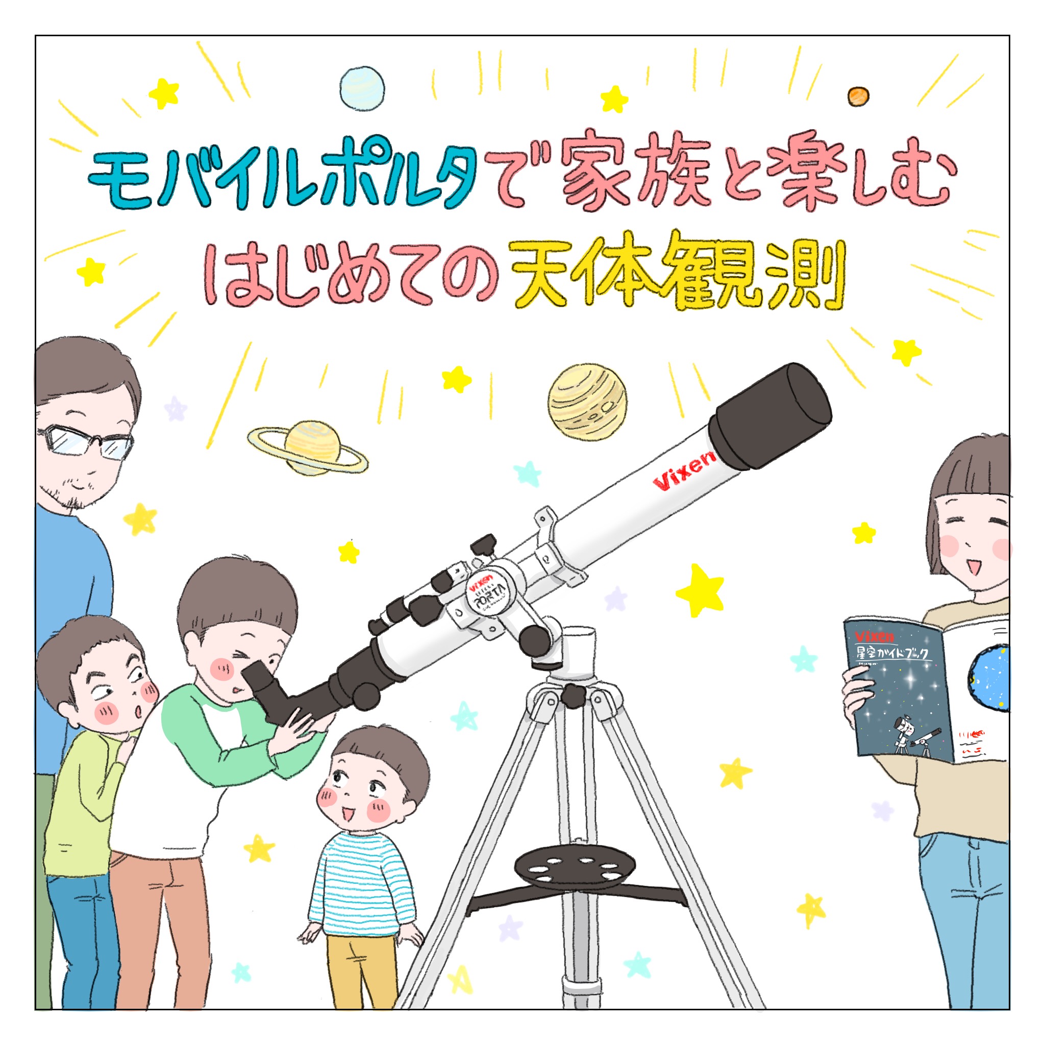 子育て絵日記がInstagramで人気を集めるイラストレーター・マルサイさん一家がはじめての天体観測を体験!自宅でもお出かけ先でも、簡単に使用できるコンパクト経緯台モバイルポルタなら、お子様とも気軽に天体観測を楽しめます。