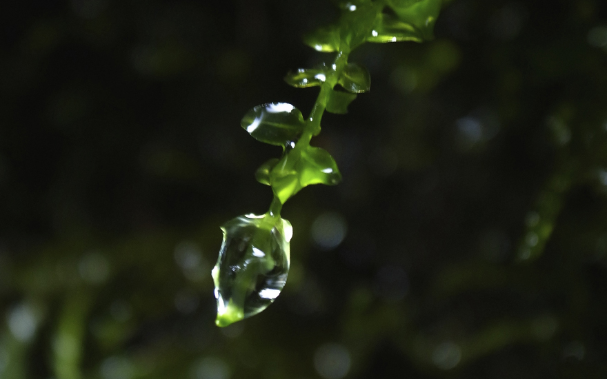 雨上がりのコケを指先で圧してみると、じゅわっと水があふれてきます。その保水力には目を瞠らされることでしょう。水をたっぷりと含んだコケは、全く別の植物のようです。姿もかたちも、まるで違います。晴天続きでコケが乾いているときには、小さな霧吹きで水を与えてあげるとよいでしょう。吸水性に長けたものは、見る見るうちに葉が開き、そのスピーディーな変化は感動します。濡れてもあまり変わらない種もありますが、水滴をまとった姿を光に透かしてみるとよいでしょう。美しく芸術的なコケのアートが楽しめます。