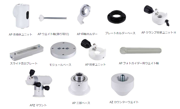 と「APウエイト軸」を、それぞれ「AP三脚ベース」と「AZカウンターウエイト」に置き換えることで、経緯台仕様の「APZマウント」として使用することが可能です。