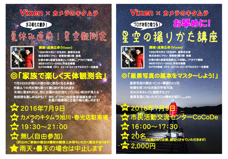 株式会社ビクセン(代表取締役:新妻和重 本社:埼玉県所沢市)は、7月9日(土)に行われるカメラのキタムラ旭川・春光店主催のイベント『星空の撮りかた講座&星空観測会』に協力します。