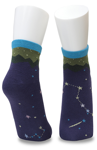 「北斗七星」「はくちょう座」「ペガスス座」「オリオン座」をモチーフに、4つの星空をデザインに取り入れたソックスです。デザインごとに配色を変化させ、モチーフに合う夜空の色を表現しています。