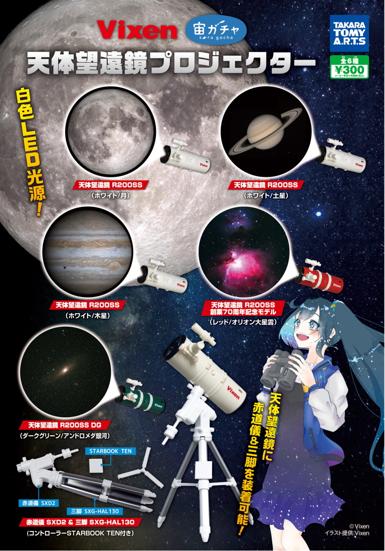 「Vixen 天体望遠鏡プロジェクター」は、R200SS鏡筒5種、SXD2赤道儀&三脚セット1種の全6種。株式会社タカラトミーアーツより、2020年5月に発売が開始されます。