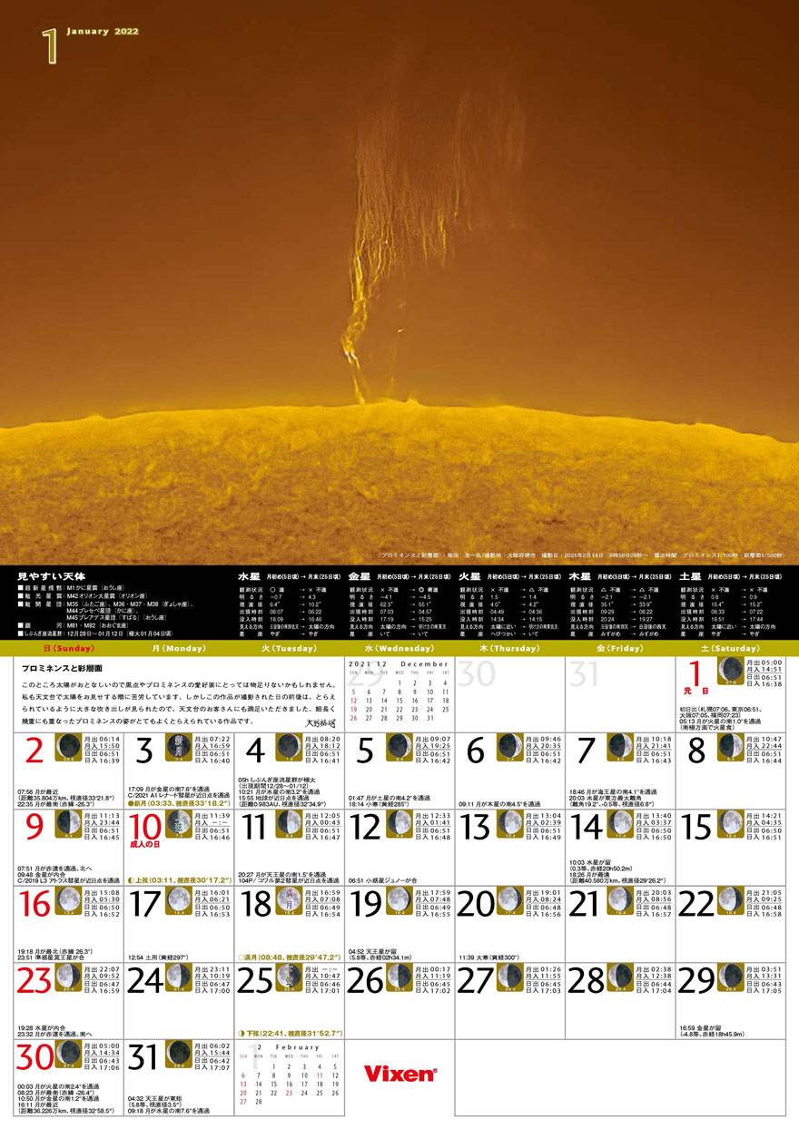 総合光学機器メーカー株式会社ビクセン(本社:埼玉県所沢市、代表取締役:新妻和重)は、「ビクセンオリジナル天体カレンダー2022年版」を2021年12月2日(木)より発売します。さまざまな天体写真が毎月のページを飾る、天文情報満載のカレンダーです。