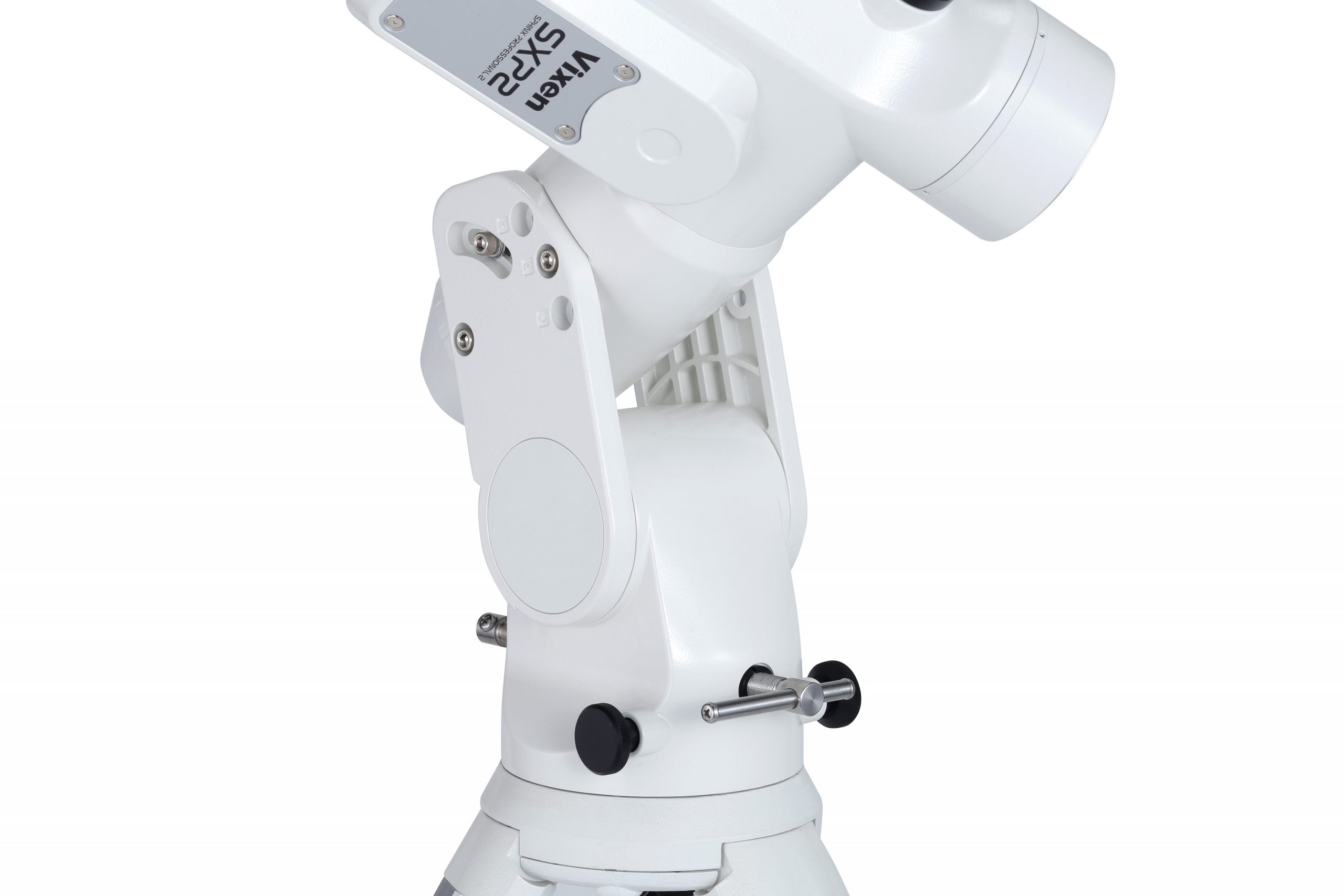 初代SXP赤道儀は、赤経側の軸受けに一対のボールベアリングを採用していましたが、後継のSXP2赤道儀では、より強度の高い大型テーパーローラーベアリングに変更しました。さらにSXP2赤道儀は、初代SXP赤道儀より軸受けの間隔を広くとることで耐荷重性能を向上しています。また、極軸ハウジングの厚みも増加。架頭部は上位機種であるAXJ赤道儀と同じ部品を使用しています。フォーク式構造にしたことで安定性も増し、赤道儀としての総合的な剛性が大幅に向上しました。