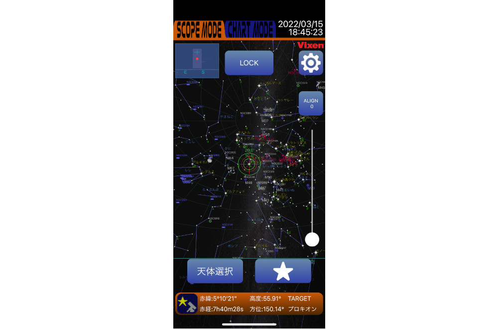また、Wi-Fiの再接続をした際には、ワイヤレスユニット側で保持しているデータを引き継ぐため、アプリ画面に表示される星図等は自動更新されます(赤道儀の向きとアプリ画面の星図は一致します)。再度アライメントを行う必要はありません。