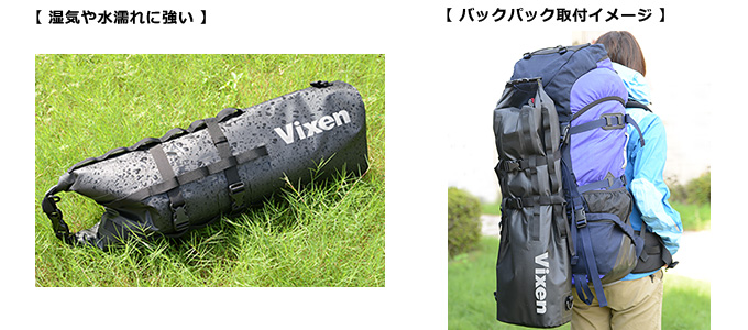 バッグ全体にフォームが入っているので、鏡筒・三脚を安全に収納できます。バックパックに固定する際に便利なデージーチェーンは、高さ25cm部分から64cmまで調整が可能です。固定ベルト2本でしっかりとバックパックに付けられます(長さ調節可能・バックル式)。