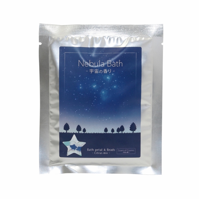Scent of Cosmo ネビュラバス プレアデス星団はミルキーパールのバスビーズとブルートーンのバスペタルが贅沢に使われた入浴料です。ビーズは湯にさっと溶けて、ほんのりパールがかった湯色になります。ペタルは石鹸成分でできているので、水面で漂いながらゆっくり湯にとけてゆきます。